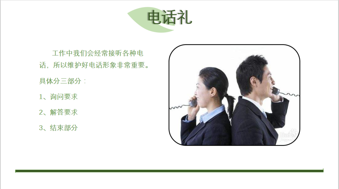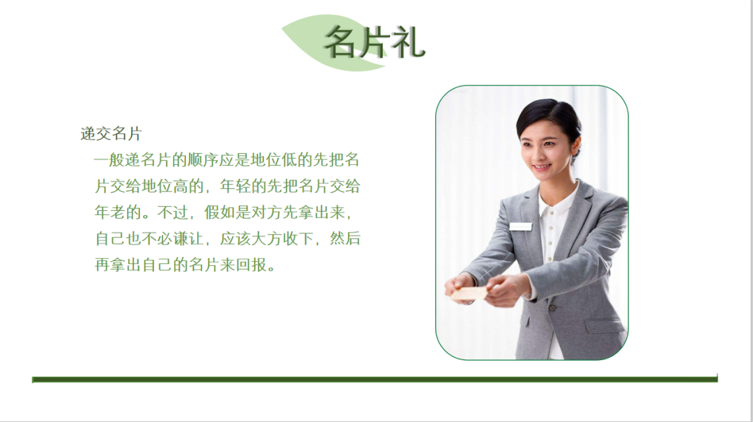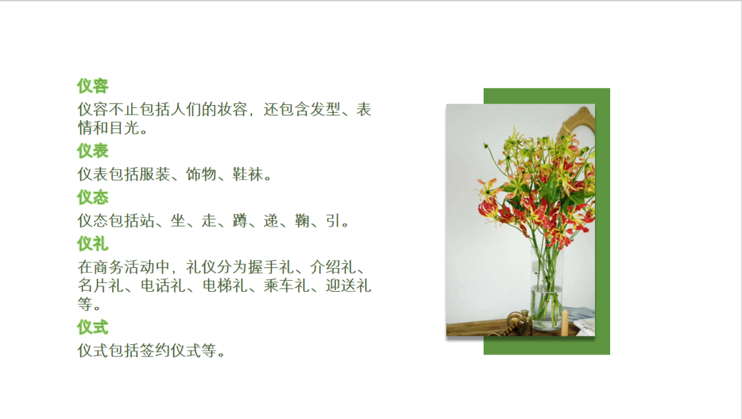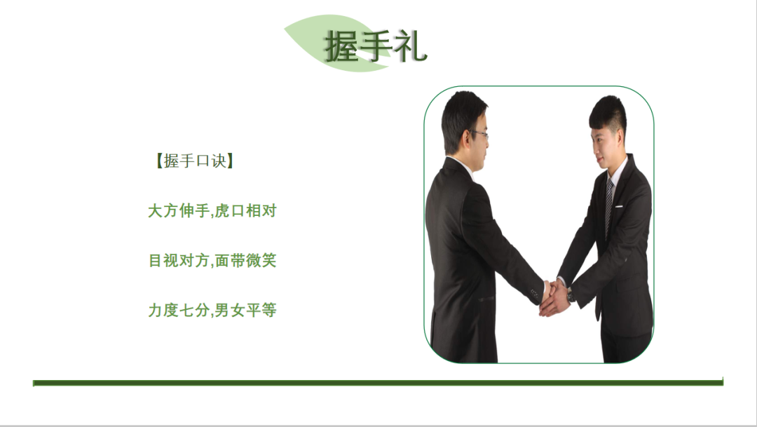主讲人从职场形象、握手礼仪、投递名片等细节出发,深入浅出地讲解了沟通技巧和日常商务礼仪规范,对会面礼仪、着装礼仪、会议礼仪、电话礼仪等内容做了细致讲解,通过运用PPT画面以及视频演示来帮助大家加深理解,让大家更加直观的感悟细节,并深刻认识到礼仪在商务活动、工作生活和人际交往中的重要性。