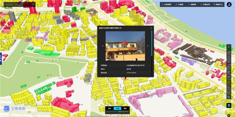 产品事业部程琳从系统架构、功能模块、应用形式三大方面对“艾维地图”进行了整体介绍。“艾维地图”整体采用微服务架构,基于ESRI二三维一体化平台,结合倾斜摄影测量、遥感影像深度学习和动态监测、房产经济大数据分析、共享服务、云计算、全景视图、3D可视化等技术,建立了一套城市二三维数据综合展示系统。该系统立足于威海市,实现了倾斜摄影数据可视化、全景视图、规划专题、地下空间、数据中心、空气质量、物联设备数据接入、大数据分析等功能模块。“艾维地图”从专业的GIS角度出发,以全新的视角和丰富多彩的展现形式,面向公众展示瑰丽多彩的威海全貌。